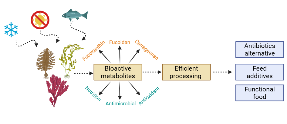 The ongoing crisis of antibiotic resistance poses a global threat to public health, and the increasing prevalence of multidrug-resistant bacteria may become one of the leading causes of death in the near future. It is therefore necessary to search for effective alternatives to traditional antibiotics. One promising avenue is metabolites derived from algae, which produce a wide range of bioactive compounds in order to function in the demanding conditions of the marine environment. Many of these compounds have health-promoting properties, including antibacterial, antioxidant, anti-inflammatory and anti-cancer properties. Of particular importance are for e.g. fucoidan, carrageenan and fucoxanthin, which, both in the form of isolated substances and appropriately prepared algae biomass, can be valuable substitutes for antibiotics. In addition, algae are a rich source of macro- and microelements and other nutrients, which makes them attractive additives to feed for farm animals, especially after the withdrawal of antibiotic growth promoters. Not only can they support growth rates and overall animal health, thereby filling the gap left by antibiotics, but they can also enrich feed with vitamins, minerals and other bioactive compounds. The development of effective extraction methods to obtain stable forms, as well as a thorough understanding of their mechanisms of action and determination of the safety of these metabolites, may contribute to the creation of new products that might replace antibiotics and to the production of functional foods and high-value feed additives.