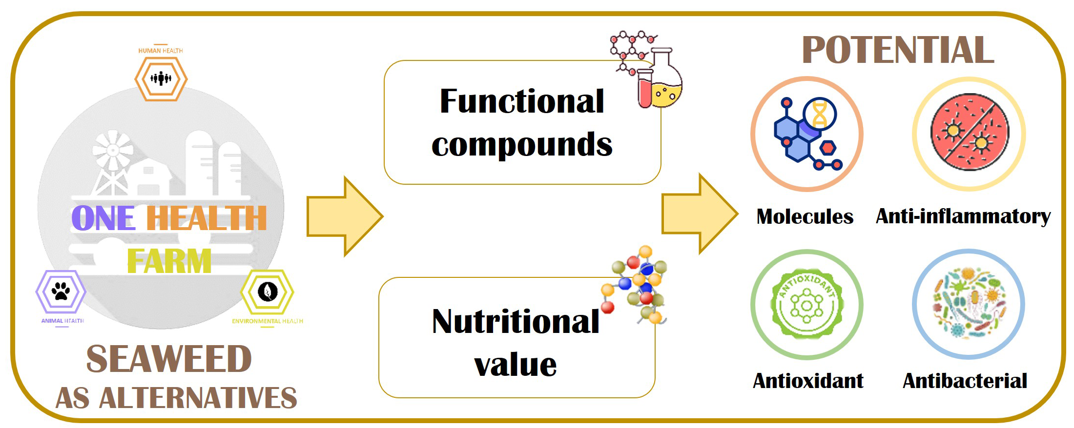 Antibiotic overuse in animal farming and other industries has led to the alarming rise of antimicrobial resistance, threatening the health of the humans, animals and environment worldwide. This growing issue has driven scientists to search for natural and novel solutions to prevent diseases in livestock without relying on antibiotics. Among potential solutions, seaweeds have emerged as a natural promising alternative. These marine organisms are rich in bioactive compounds, which are known for their anti-inflammatory, antioxidant, and antibacterial properties. Seaweeds offer thus a multifaceted approach to combat antimicrobial resistance by enhancing animal immunity and promoting gut health. Their use could reduce the need for synthetic drugs in farming systems, which in turn helps curb the spread of drug-resistant bacteria.